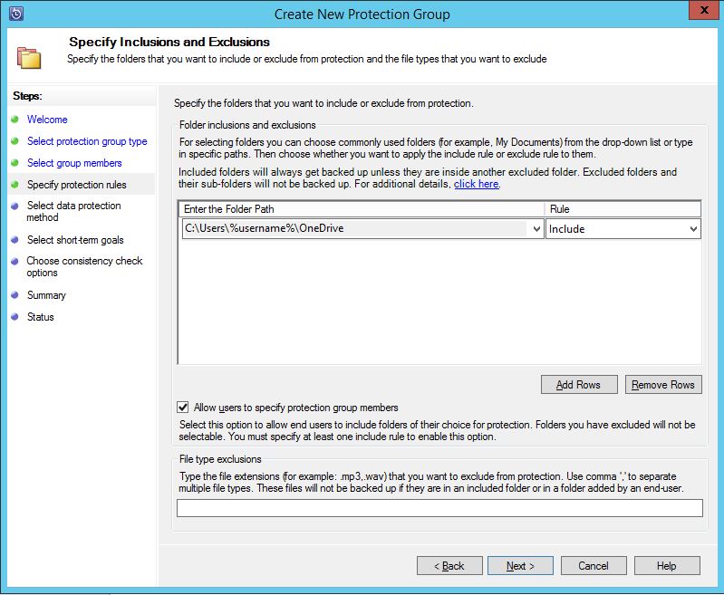 Continue through the wizard and choose your protection rules, data protection method, short (/long)-term goals and storage allocation.